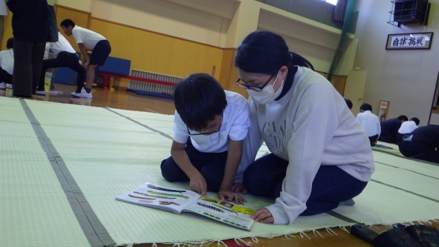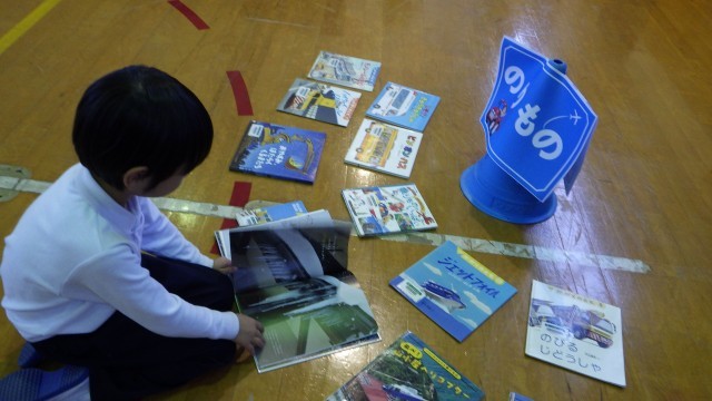 司書の方々に図書館の本をたくさん持ってきていただき、最後に親子読書タイム。