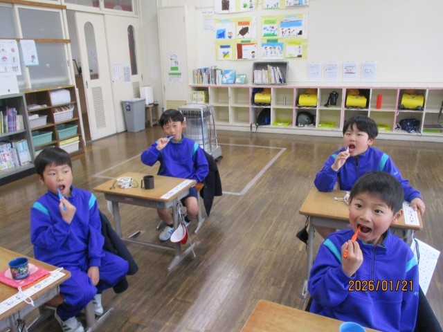 歯磨きウィーク 公開日 2026/01/23 更新日 2026/01/23 学校生活のようす 1月21日(月)から一週間は、歯磨きウィークです。全校で音楽に合わせて歯を磨いています。磨き残しがないように、順番に丁寧に磨いています。 全校
