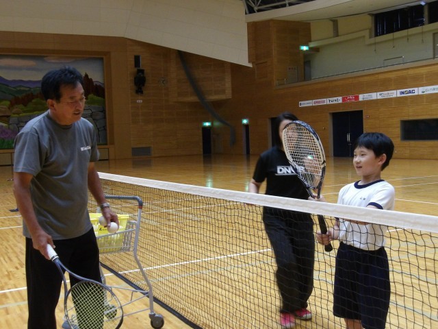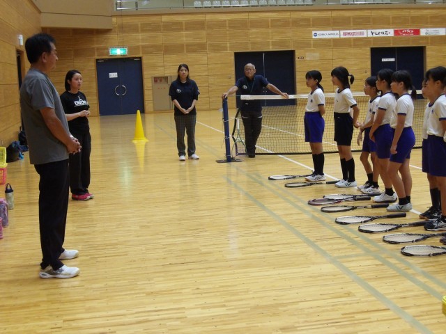 お弁当を食べた後,「どんぐり北広島ソフトテニスクラブ」の中本監督と松村選手に教えてもらいました。