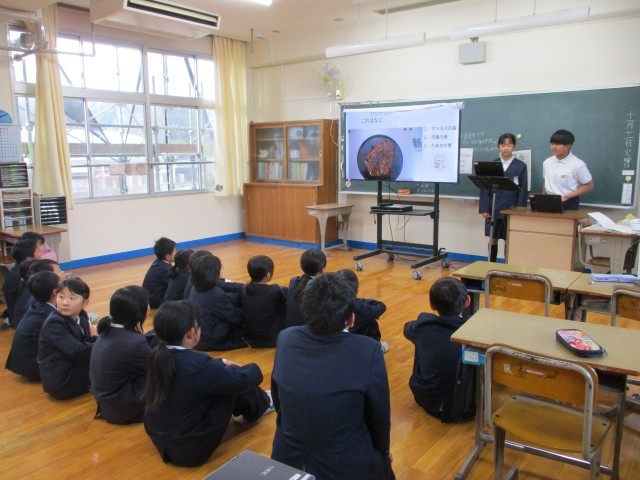 10月の修学旅行で行ったキッザニア福岡やいのちの旅博物館,海の中道マリンワールドなどについて、1年生から5年生に紹介したり,クイズを出したりしました。