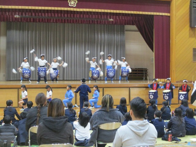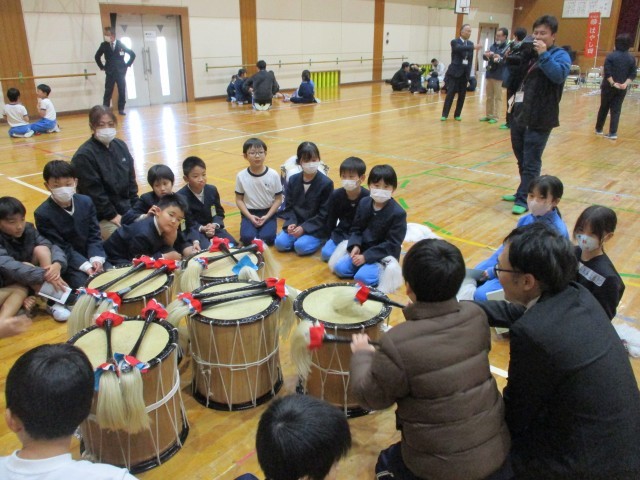 大朝小のはやし田と壬生小のこども田楽をお互いに披露し,各担当に分かれて交流しました。