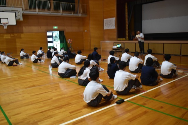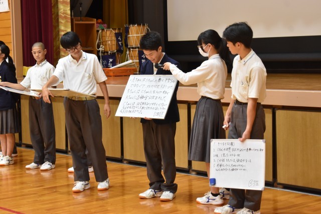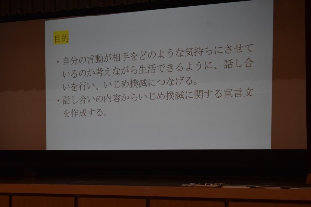 生徒会執行部が中心となり、いじめ0の会を行いました。いじめの定義について確認し、事例について縦割りグループで議論しました。何がいじめにあたるのか、その時どういう気持ちだったのかなどを考えることができました。最後には、「大朝中学校でいじめを起こさないためにはどうすればいいだろう」について考えることができました。