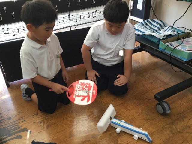 完成したおもちゃで遊んでもらおうと、1年生を招待しておもちゃ遊びの会を開きました。1年生に優しく遊び方を教えてあげる姿に、2年生の成長を感じました。1・2年生にとって楽しいふれあいの時間となりました。