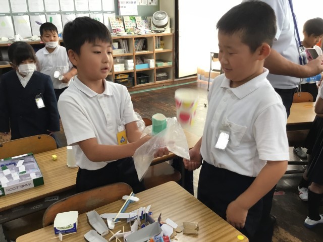 2年生が生活科の学習で「動くおもちゃ」を作りました。車や、紙コップロケット、ことこと亀さんなど、工夫いっぱいのおもちゃがたくさんできあがりました。