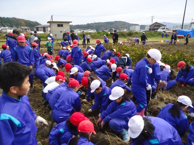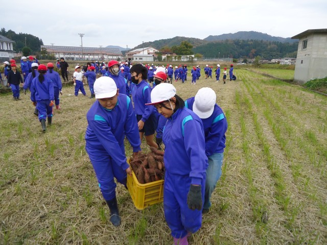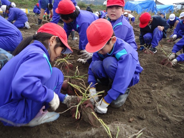秋晴れの中、春に全校で苗を植え、6年生が一生懸命世話をしてきたさつまいもを収穫する「全校さつまいも掘り大会」を行いました。
