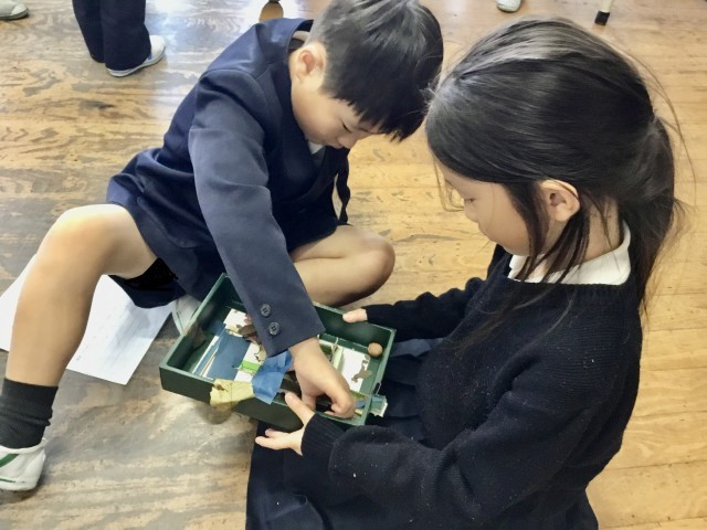 1年生は、どんぐりや松ぼっくりなど、秋の実を使っておもちゃを作りました。