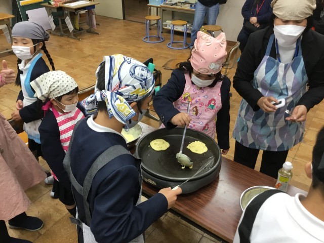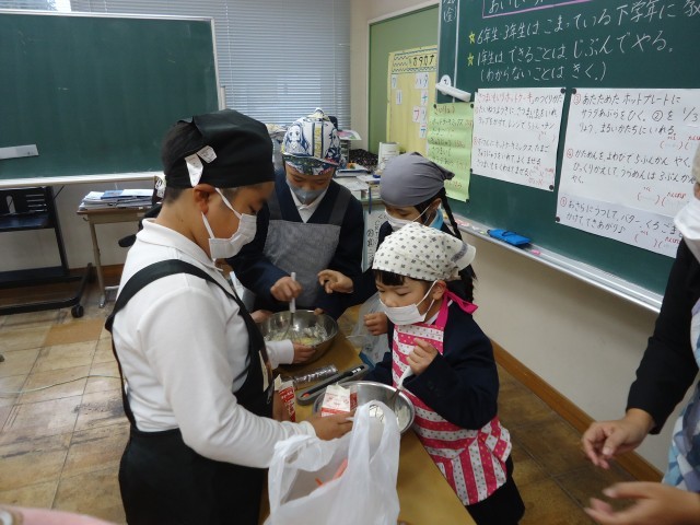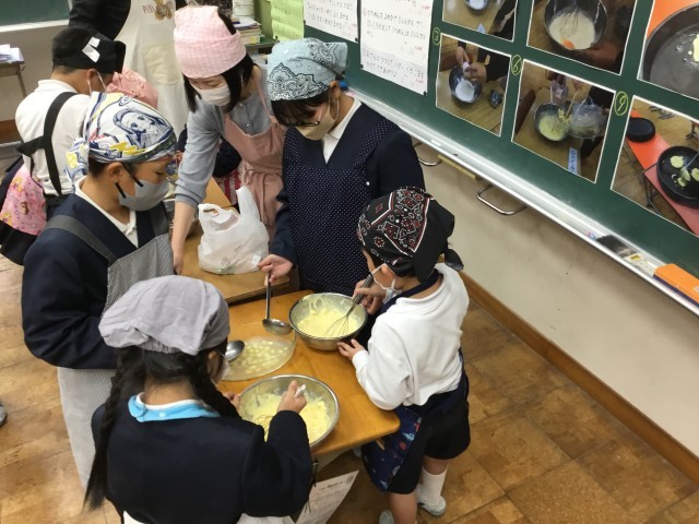 授業参観では、つくし学級・たんぽぽ学級が合同で自立の学習「ホットケーキ作り」に取り組みました。上級生は、「困っている下級生にやさしく声をかけて手伝う」、1年生は「できることは自分でやる」「わからなかったら聞く」というめあてをもって活動に取り組みました。