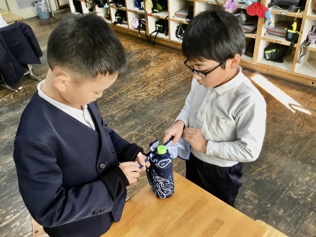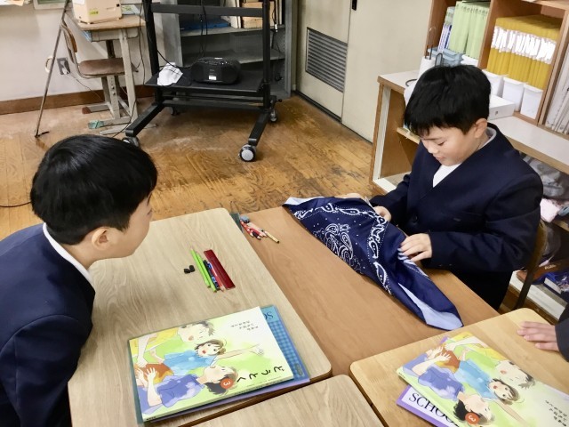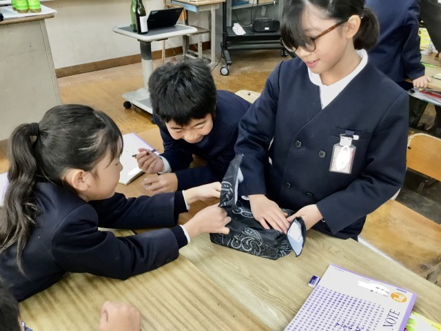 子供たちは、結び方や包み方を工夫しながら、「ふろしきは、いろんなことができる宝物だね」「明日は、自分の水筒を包んで持ってきたいな」と、日本に昔から伝わるものの便利さや魅力を感じ取っていました。