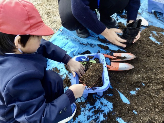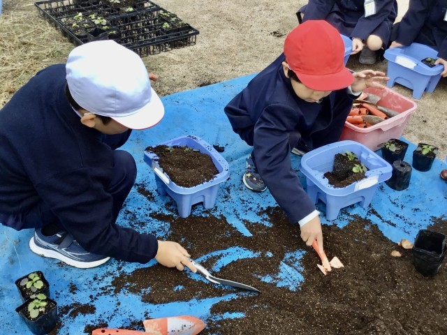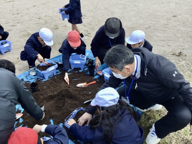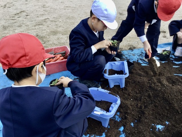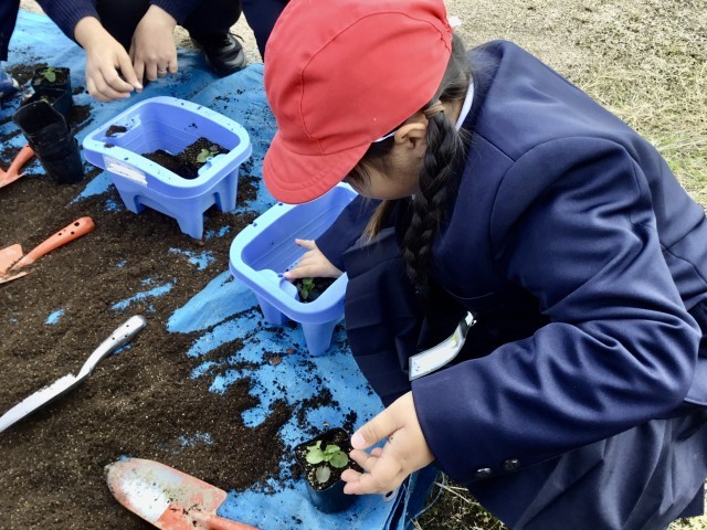 1年生が、チューリップの球根とパンジーの苗を植えました。