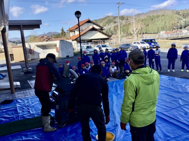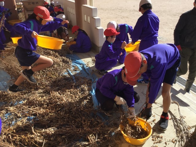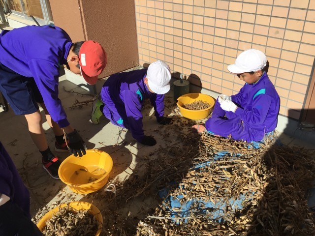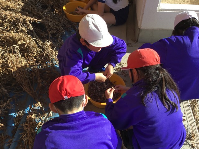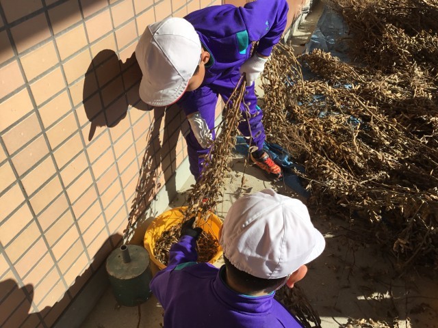 4年生は、11月末に、はで干しをした大豆の脱粒作業を行いました。