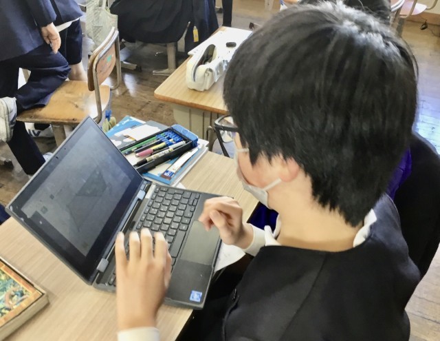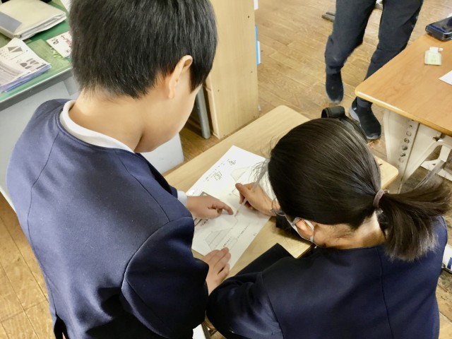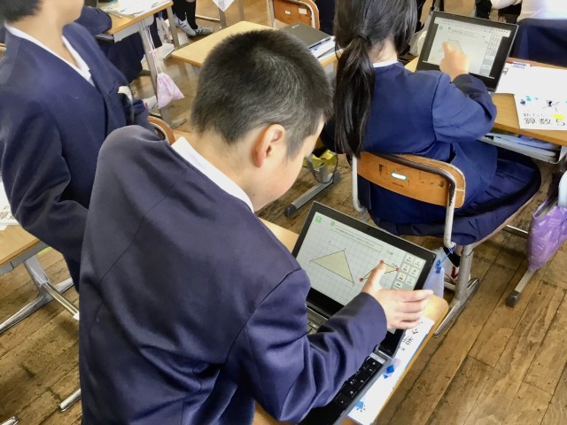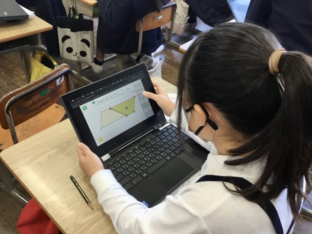 ICT機器を活用し、図形を切ったり、向きを変えたり、組み合わせたりしながら、「どうすれば台形の面積が求められるか」を考えました。ICTを使った学びを通して、主体的に考える力を伸ばしていきます。