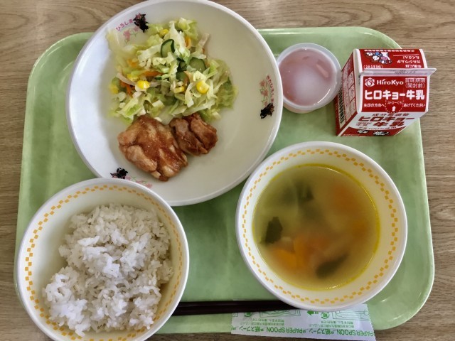 2学期最後の給食は、鶏肉のバーベキューソース焼きやイチゴゼリーなど、クリスマスを感じるメニューでした。
