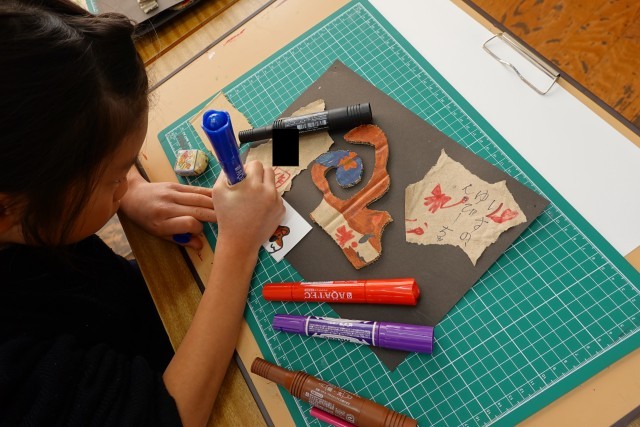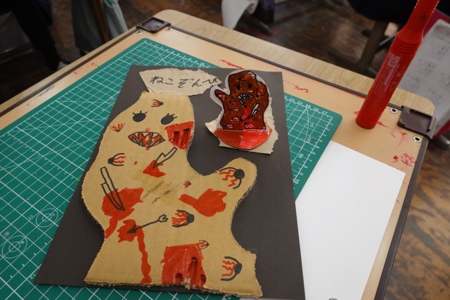 という設定で、2学期にダンボールモンスターを作成しました。5年生が、2学期に電動糸のこぎりを使う練習で使ったダンボールの切れ端を使って、不思議な形からモンスターを想像して描きました。今回は、そのモンスターの続きのお話。