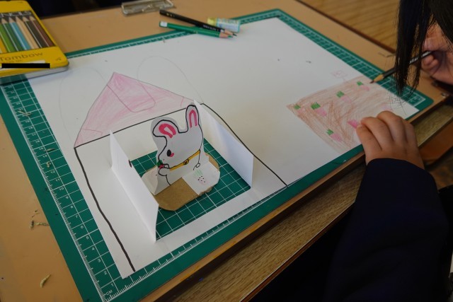 そこから、今回の作品作りが始まりました。「平面作品」が「立体的な作品」に代わることも楽しみながら作っておりました。そして、その世界には「一つのあな」からつながる「おもて」と「うら」の世界があることも伝えて作品を作っております。画用紙のおもてとうらの世界を想像して描くことが今回の学習の大切な目標です。来週、仕上げをしていく予定で、子どもたちも仕上がりを楽しみにしています。