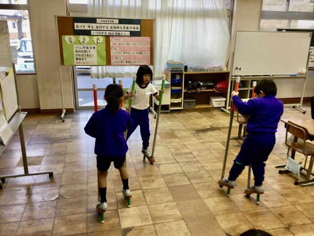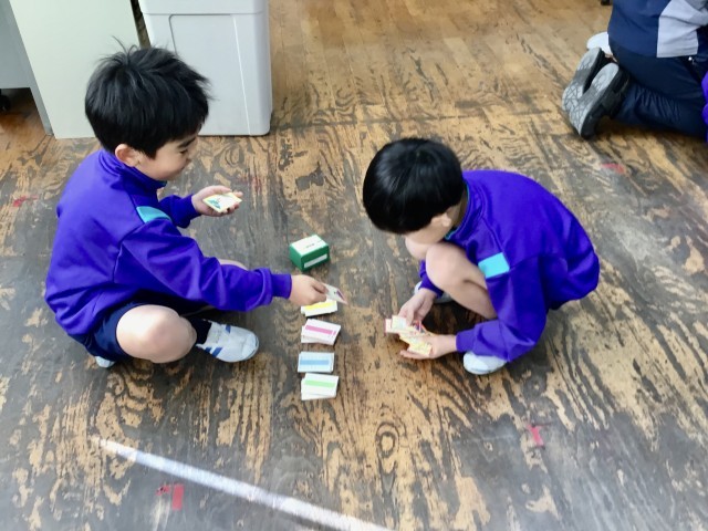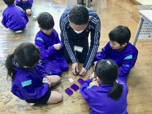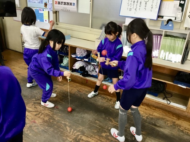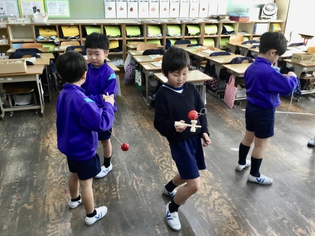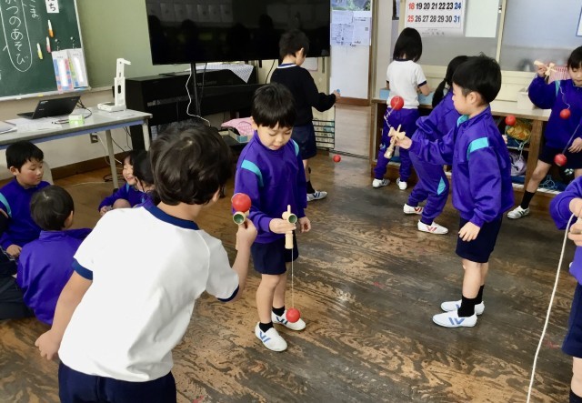 こまやけん玉、竹馬、ぼうずめくりなど、昔から日本に伝わる遊びに実際に触れ、友だちと一緒に楽しみました。子どもたちは「楽しかった」「またやりたい」と、日本の遊びの楽しさやよさを感じることができました。