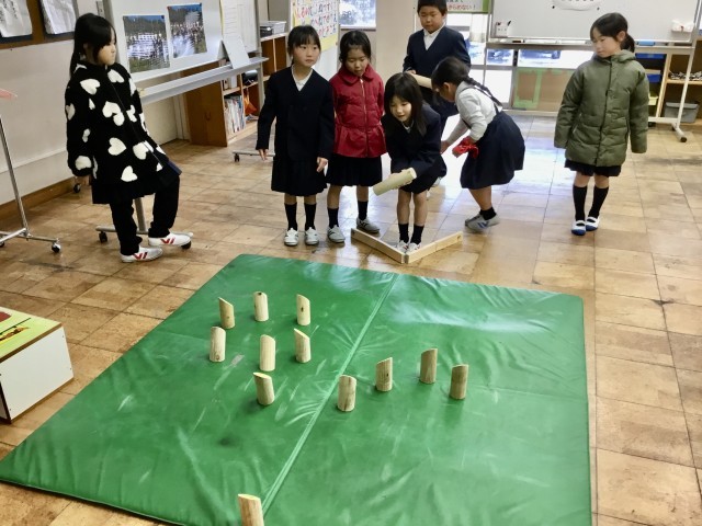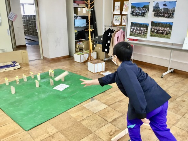 倒れたピンの数を一生懸命計算するなど、遊びの中で自然と考える力や協力する姿が見られます。初めて触れる遊びに、どの子も夢中になって取り組んでいます。千代田中学校のみなさん、心のこもった素敵なモルックをありがとうございました。大切に使わせていただきます。