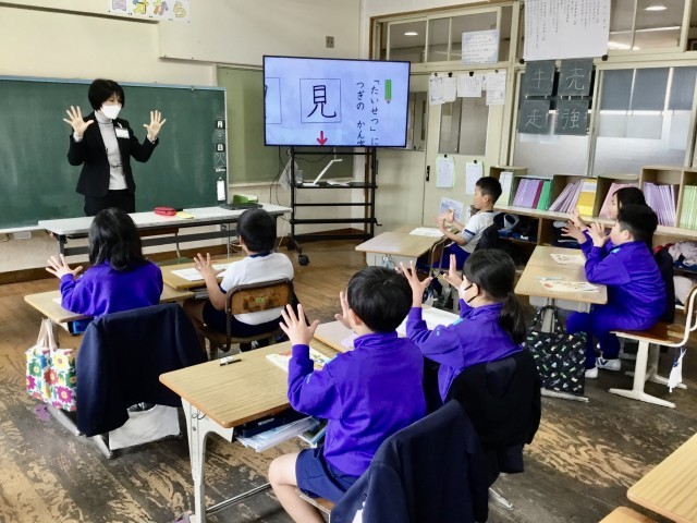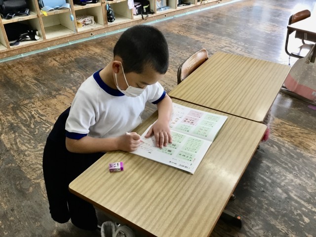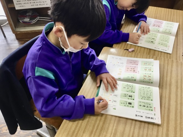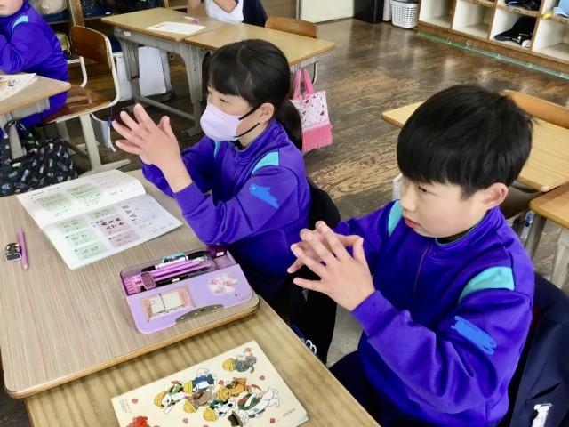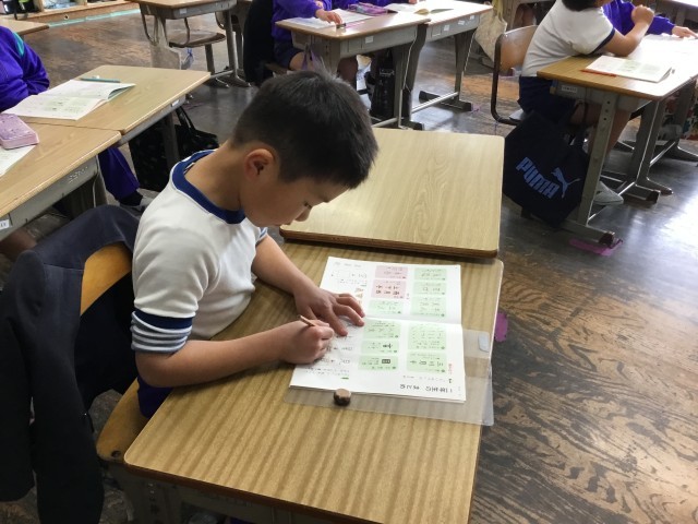 2年生の書写では、手首や指をしっかり動かす書写体操を行い、字を書く準備を整えてから学習に入っています。