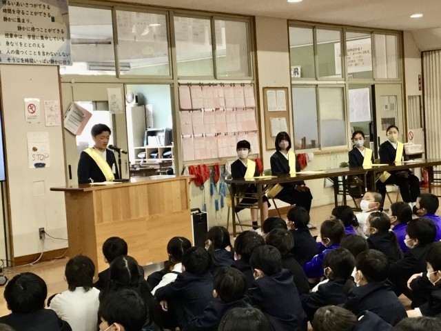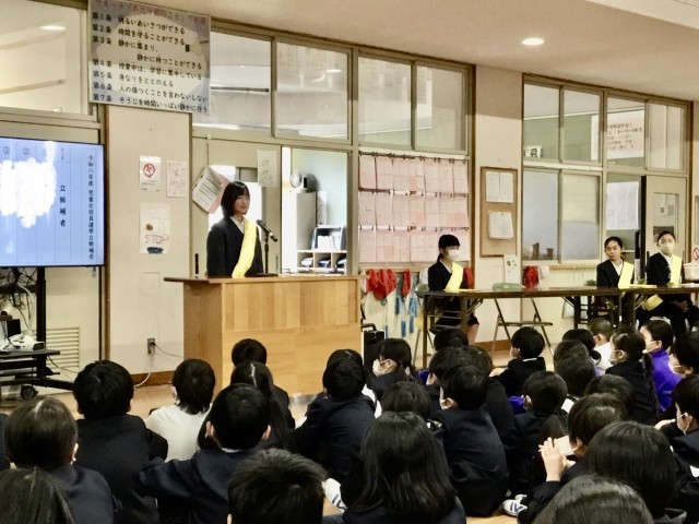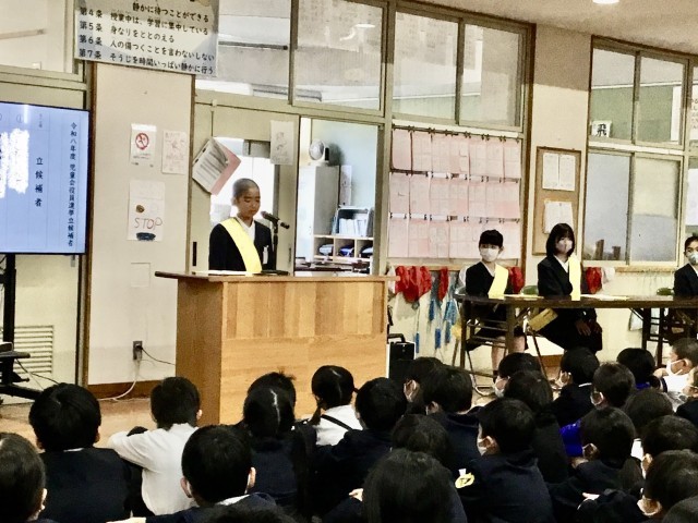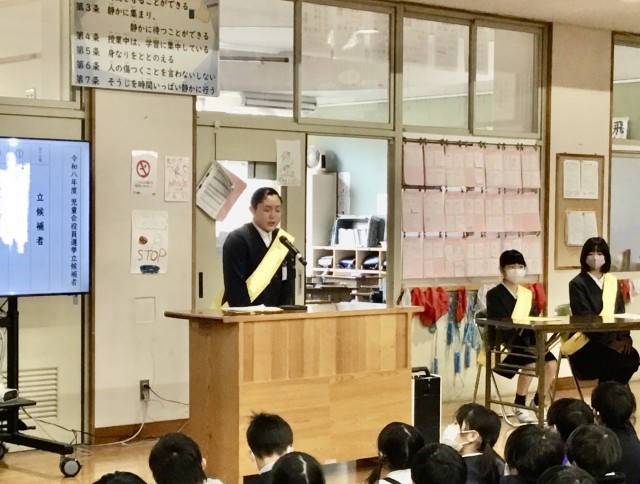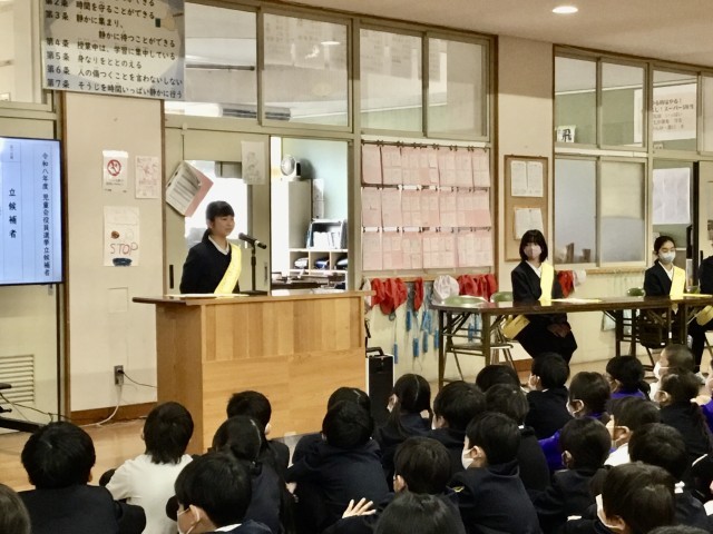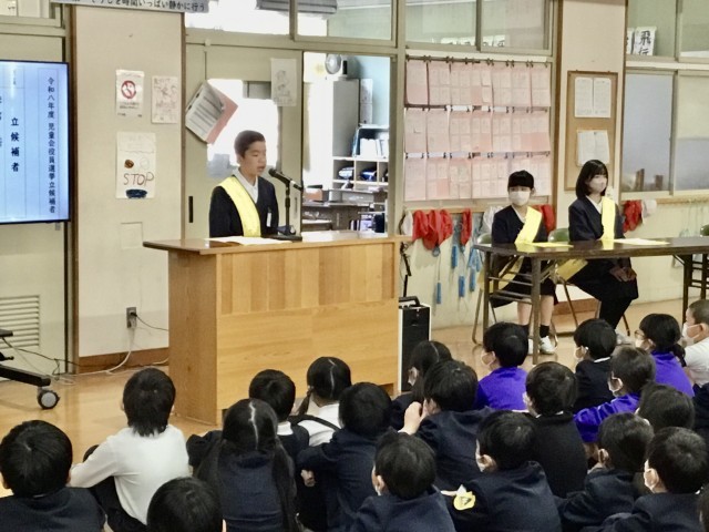 少し緊張した表情も見られましたが、どの立候補者からも、学校をよりよくしたいという強い気持ちと責任感が伝わってきました。友達の話を真剣に聞く児童の姿からも、八重小学校を大切に思う気持ちが感じられる演説会となりました。