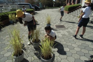 春に田植えをしたバケツ稲も、黄金色の穂が輝き、収穫の時期を迎えました。