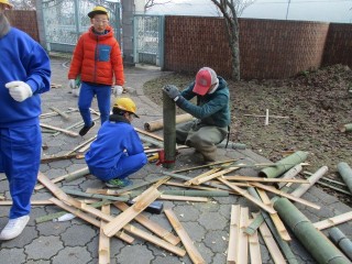 先生方に手伝ってもらいながら、たくさんの竹を割っています。